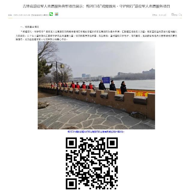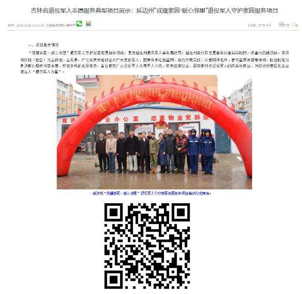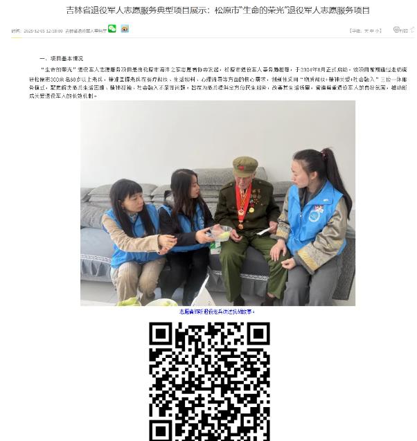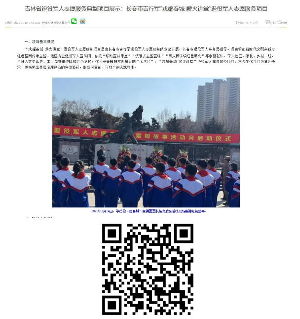 为进一步拓展退役军人志愿服务工作交流平台,促进各地“吉行军”志愿服务队互学互鉴,以项目化、专业化推动退役军人志愿服务高质量发展,在“12·5”国际志愿者日到来之际,省退役军人事务厅推出“烽火相传、志愿同行”吉林省退役军人志愿服务典型项目展播。